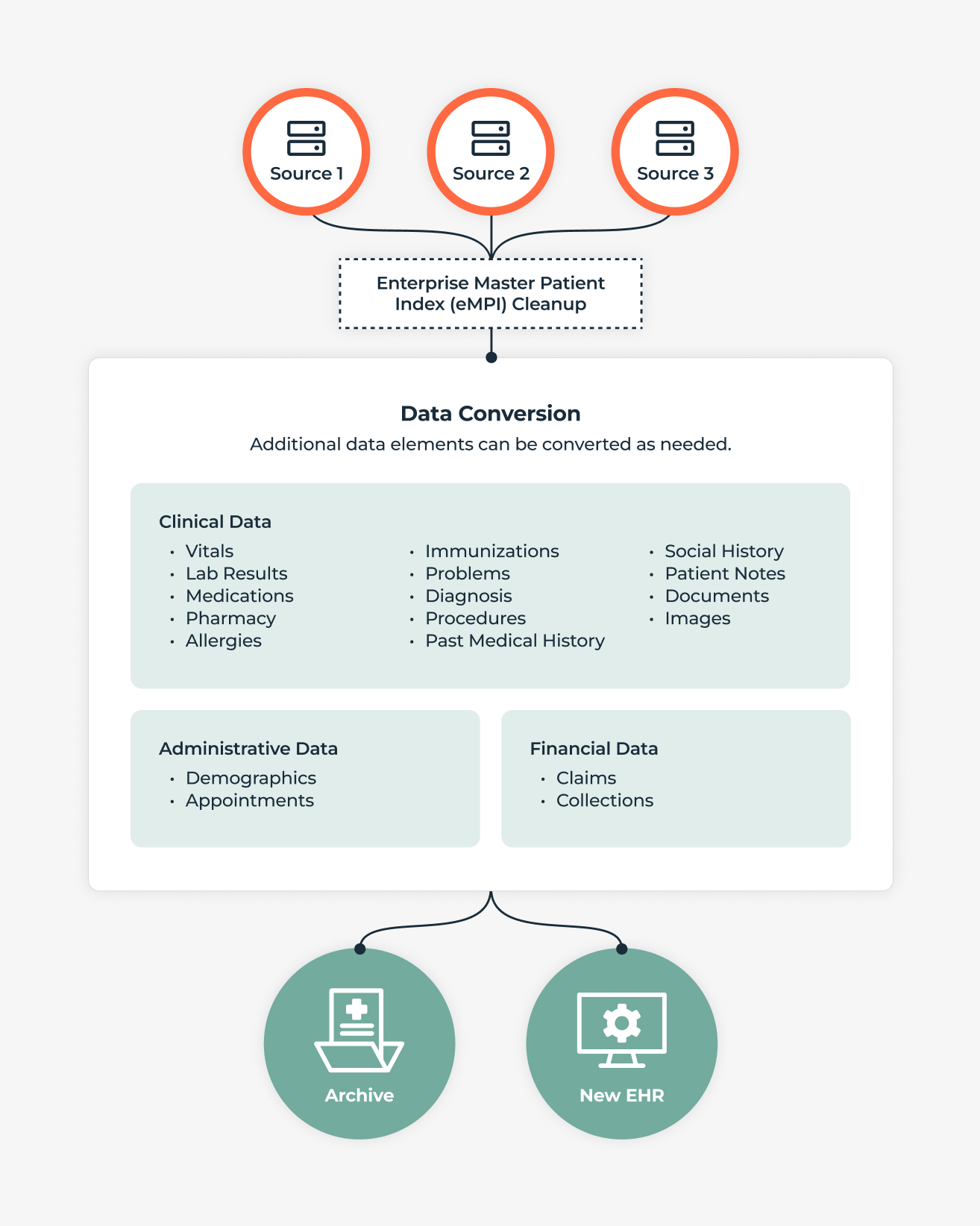 | Limit Conversion Scope | Lower conversion cost and timeline. Reduced project risk and complexity. Archived legacy data remains searchable via SSO. Lightweight EHR-like access without maintaining legacy systems. |